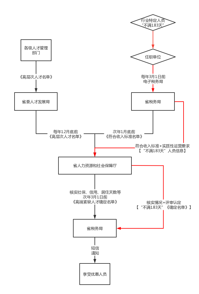 对满足“累计居住满183天”条件人员名单,省人力资  源和社会保障厅于次年3月1日前,向省税务局提供享受个人所得税优惠政策的高端紧缺人才确定名单。
